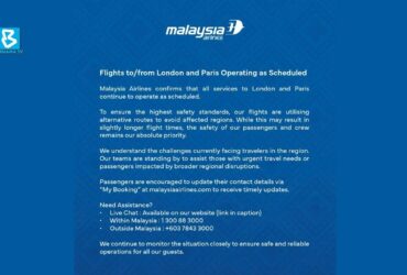 Malaysia Airlines Confirms London and Paris Flights Operating as Scheduled