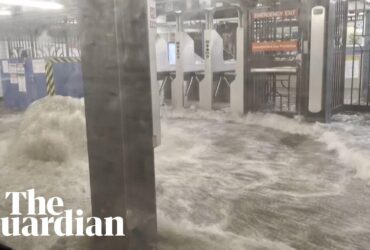 Footage shows flood water gushing into New York subway station during heavy rain