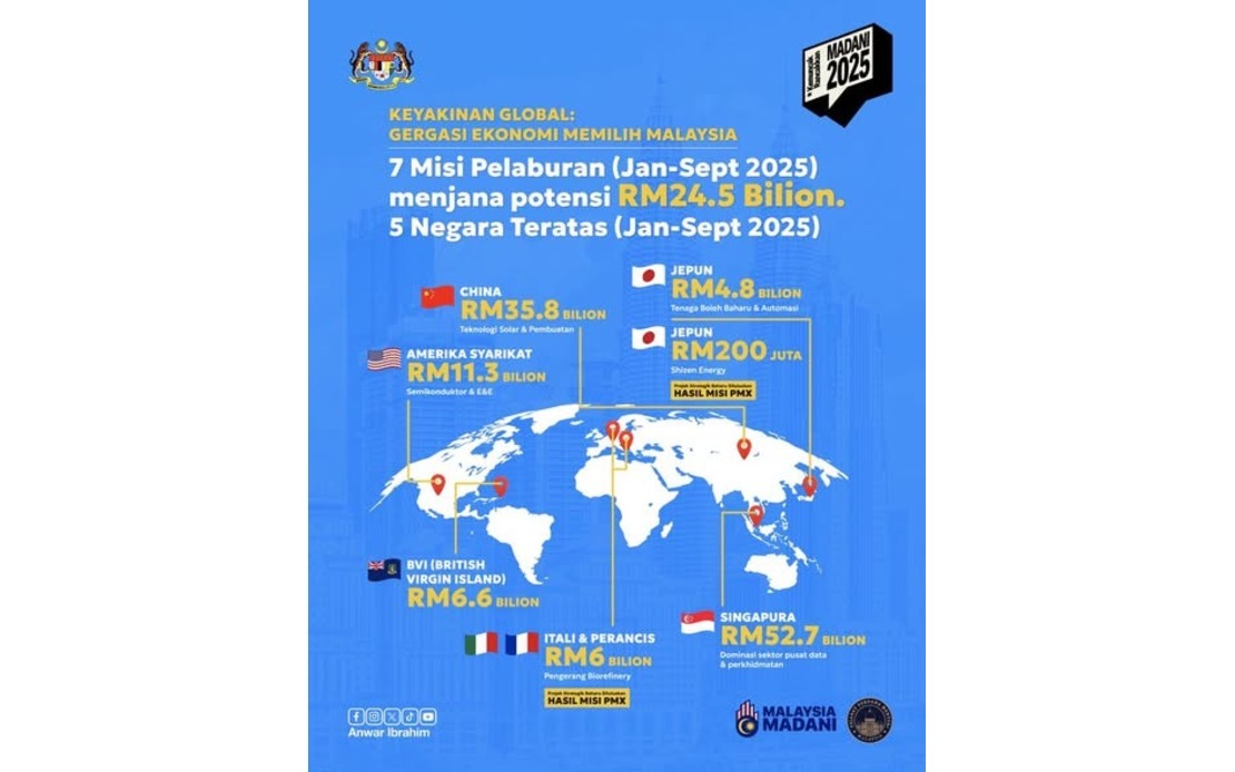 Ini termasuk infografik bahawa Malaysia terus unggul dengan mencatatkan pelaburan diluluskan bernilai RM285.2 billion bagi tempoh Januari hingga September 2025 yang melonjak 13.2 peratus dan melepasi semua rekod pencapaian pra-COVID (2006-2020).