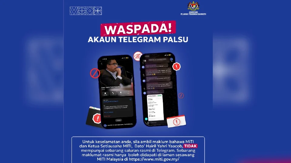 KUALA LUMPUR, 6 Feb — Kementerian Pelaburan, Perdagangan dan Industri (MITI) mengesahkan bahawa nama Ketua Setiausaha (KSU) kementerian itu, Datuk Hairil Yahri Yaacob, telah disalah guna dalam satu skim pelaburan palsu yang dikesan beroperasi melalui aplikasi Telegram.