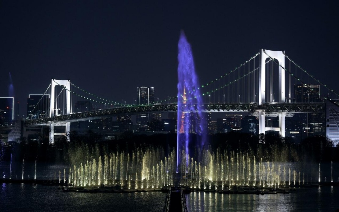 Penonton bertepuk tangan menyaksikan persembahan air dan cahaya, dengan mercu tanda seperti Menara Tokyo dan Jambatan Pelangi sebagai latar belakang.
