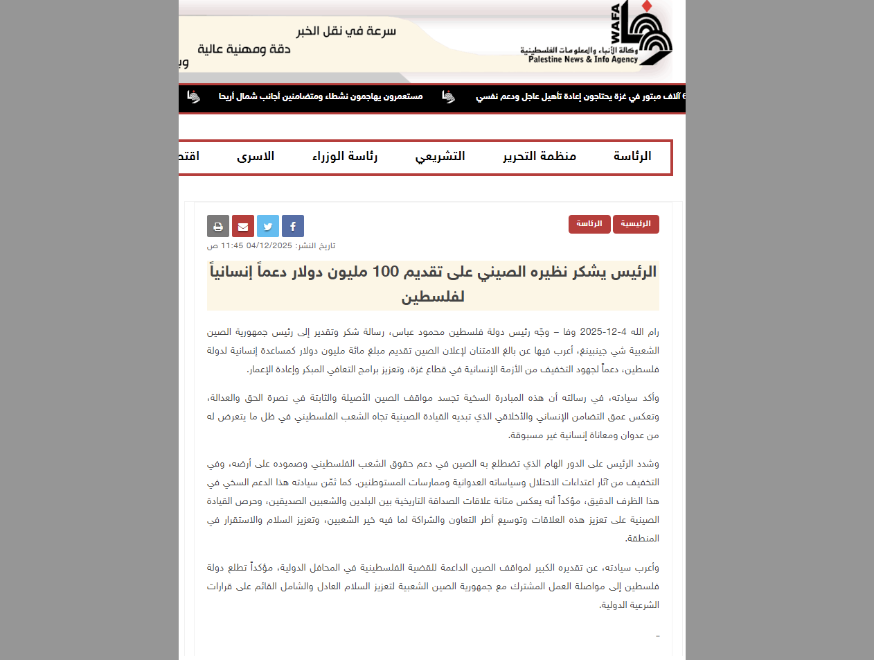 Presiden Palestin Mahmoud Abbas turut merakamkan penghargaan dan ucapan terima kasih atas bantuan kewangan yang disalurkan kerajaan China kepada Palestin.