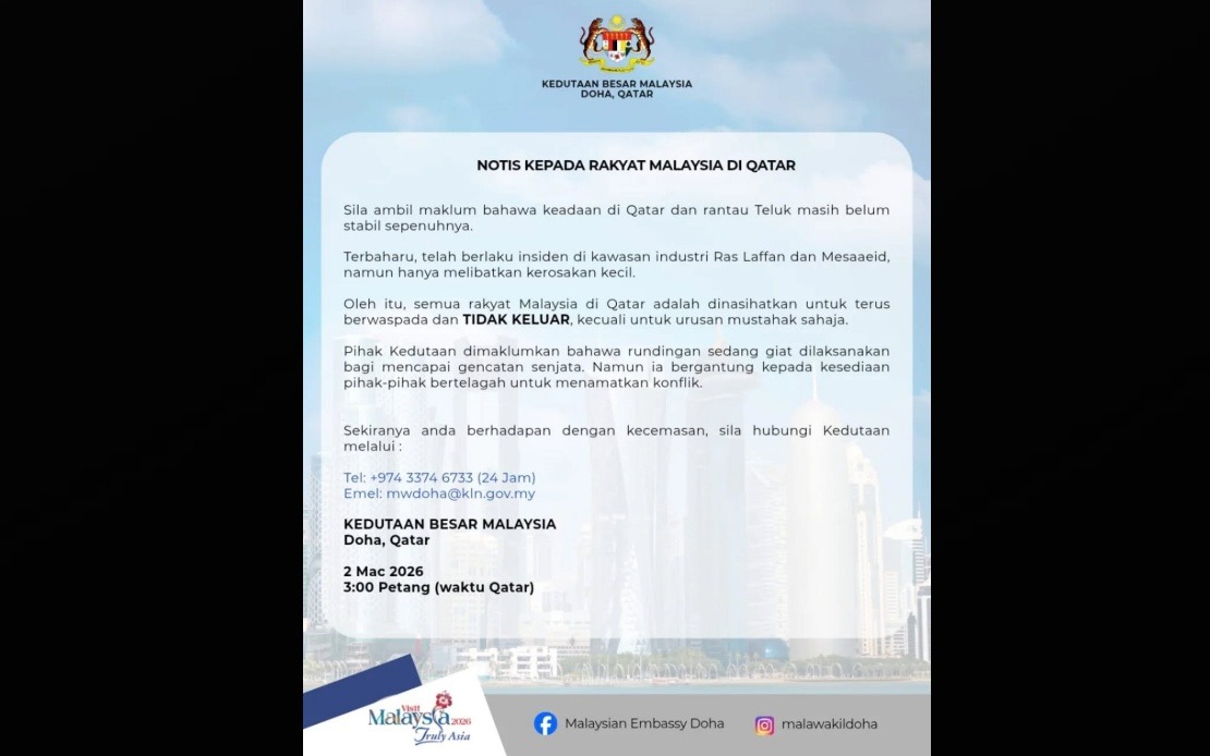 KUALA LUMPUR, 2 Mac — Kedutaan Besar Malaysia di Doha, Qatar, memaklumkan bahawa keadaan keselamatan di Qatar dan rantau Teluk masih belum stabil sepenuhnya susulan perkembangan terkini di rantau itu.