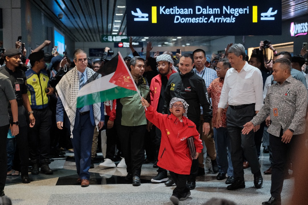Suasana dipenuhi rasa bangga, syukur dan kelegaan apabila ahli keluarga serta pendukung Palestin memakai keffiyeh dan mengibarkan bendera Palestin, memenuhi ruang ketibaan bagi menyambut para sukarelawan yang tiba sekitar 10.07 malam tadi.