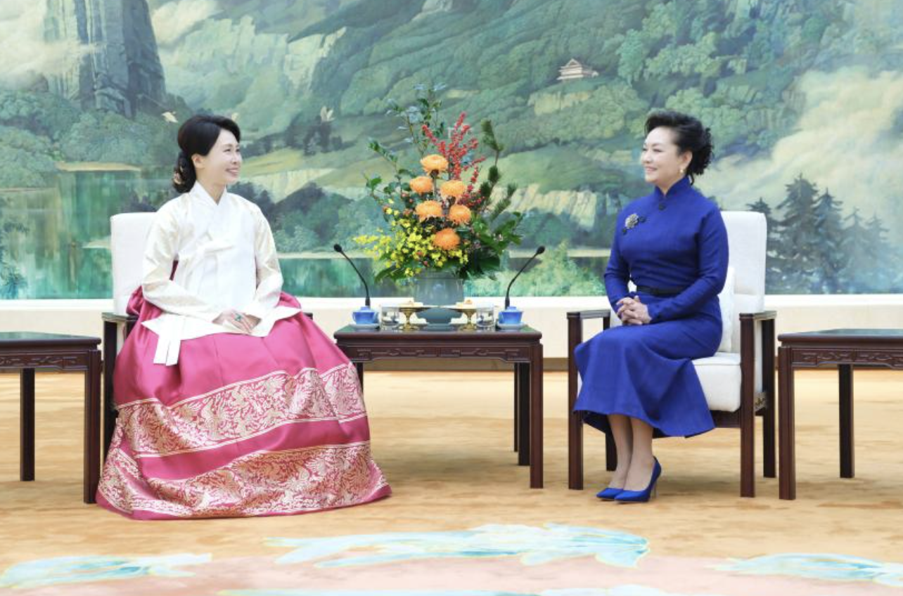 Isteri Presiden China Xi Jinping, Profesor Peng Liyuan menganjurkan resepsi minum teh untuk wanita pertama Korea Selatan, Kim Hea Kyung di Beijing pada petang Isnin.