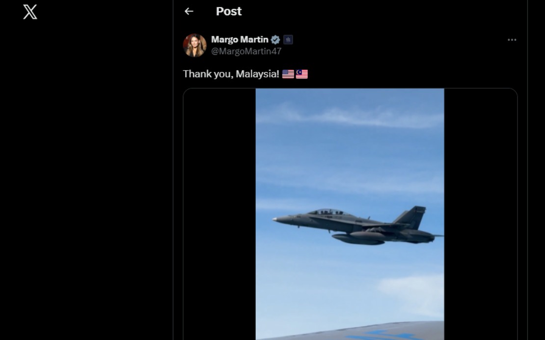 “Terima kasih, Malaysia!” menurut perkongsiannya pada akaun X https://x.com/margomartin47, yang turut menyiarkan video pendek jet pejuang Tentera Udara Diraja Malaysia mengiringi Air Force One ketika pesawat itu memasuki ruang udara Malaysia.