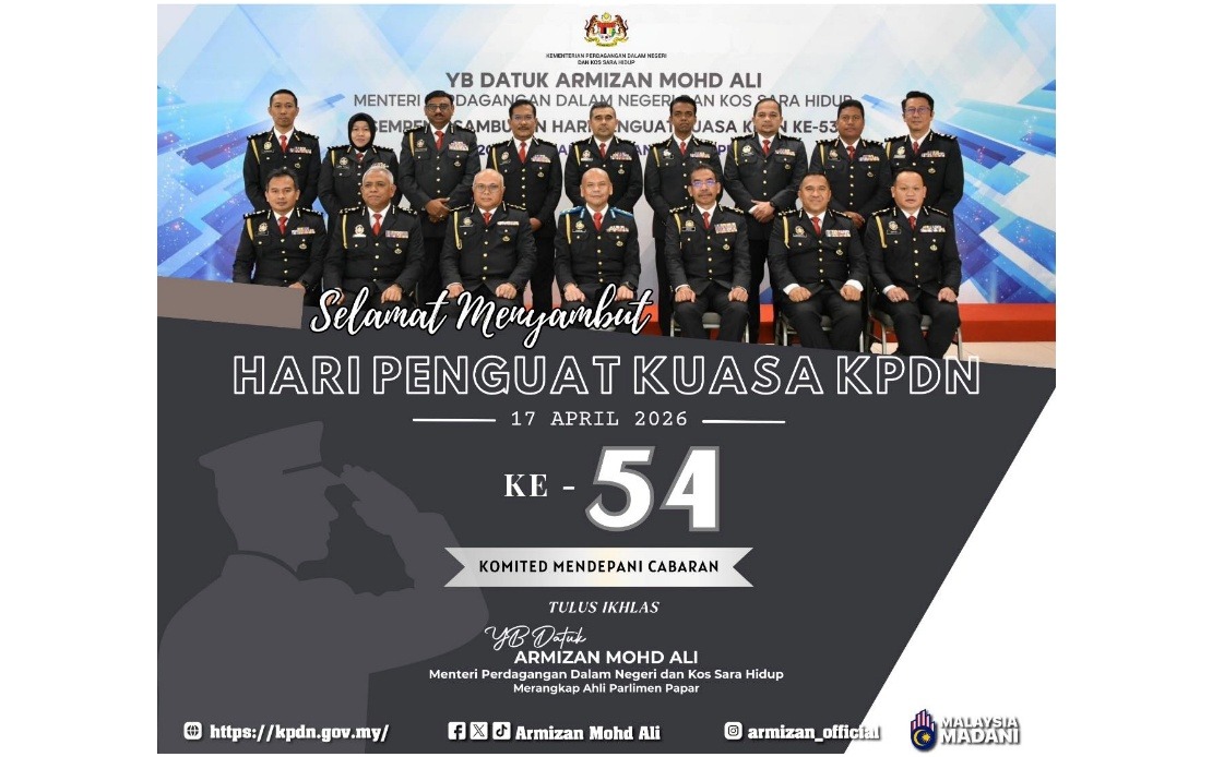 KUALA LUMPUR, 17 April — Menteri Perdagangan Dalam Negeri dan Kos Sara Hidup Datuk Armizan Mohd Ali merakamkan penghargaan tinggi kepada barisan penguat kuasa kementerian itu yang disifatkan sebagai “wira di sebalik tabir” dalam memastikan kestabilan harga serta bekalan barangan keperluan negara.