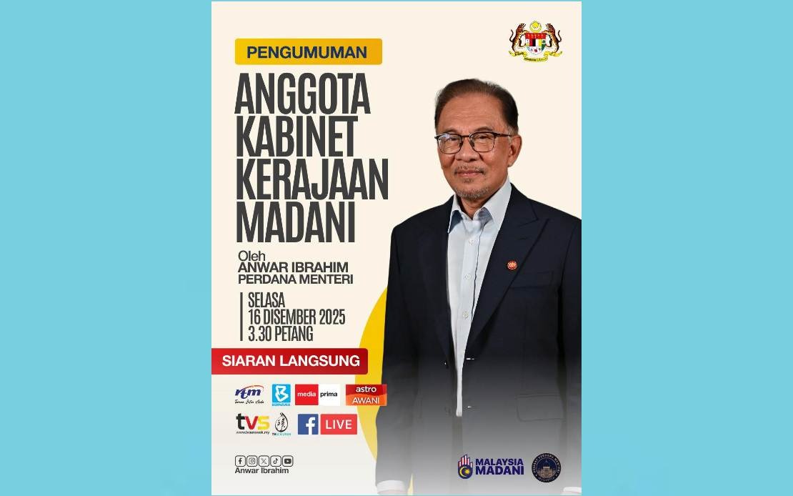 KUALA LUMPUR, 16 Dis (Bernama) — Perdana Menteri Datuk Seri Anwar Ibrahim akan membuat pengumuman khas berkaitan Kabinet Kerajaan MADANI pada 3.30 petang ini.