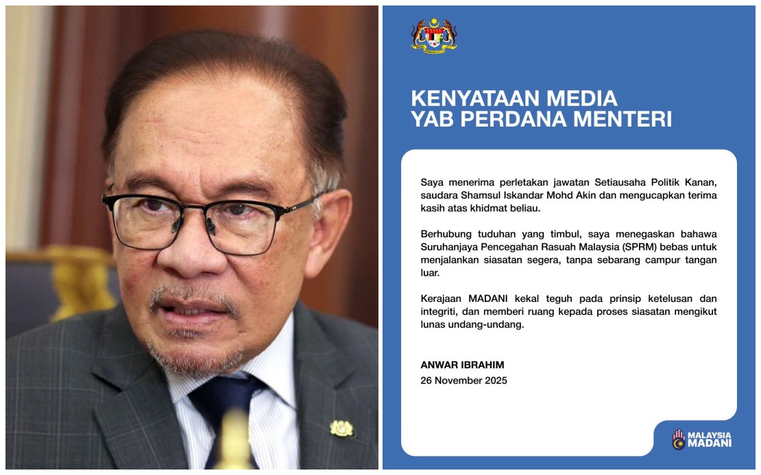 KUALA LUMPUR, 26 Nov – Perdana Menteri Datuk Seri Anwar Ibrahim hari ini menerima peletakan jawatan Setiausaha Politik Kanan beliau Datuk Seri Shamsul Iskandar Mohd Akin.