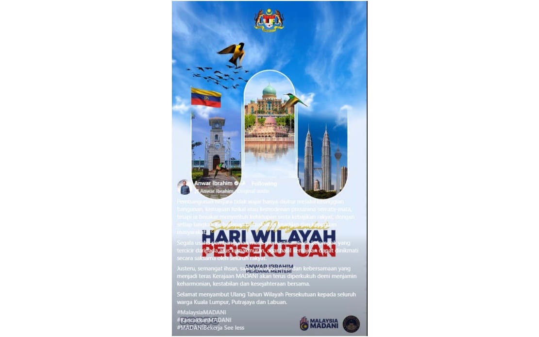 “Selamat menyambut Ulang Tahun Wilayah Persekutuan kepada seluruh warga Kuala Lumpur, Putrajaya dan Labuan,” katanya.