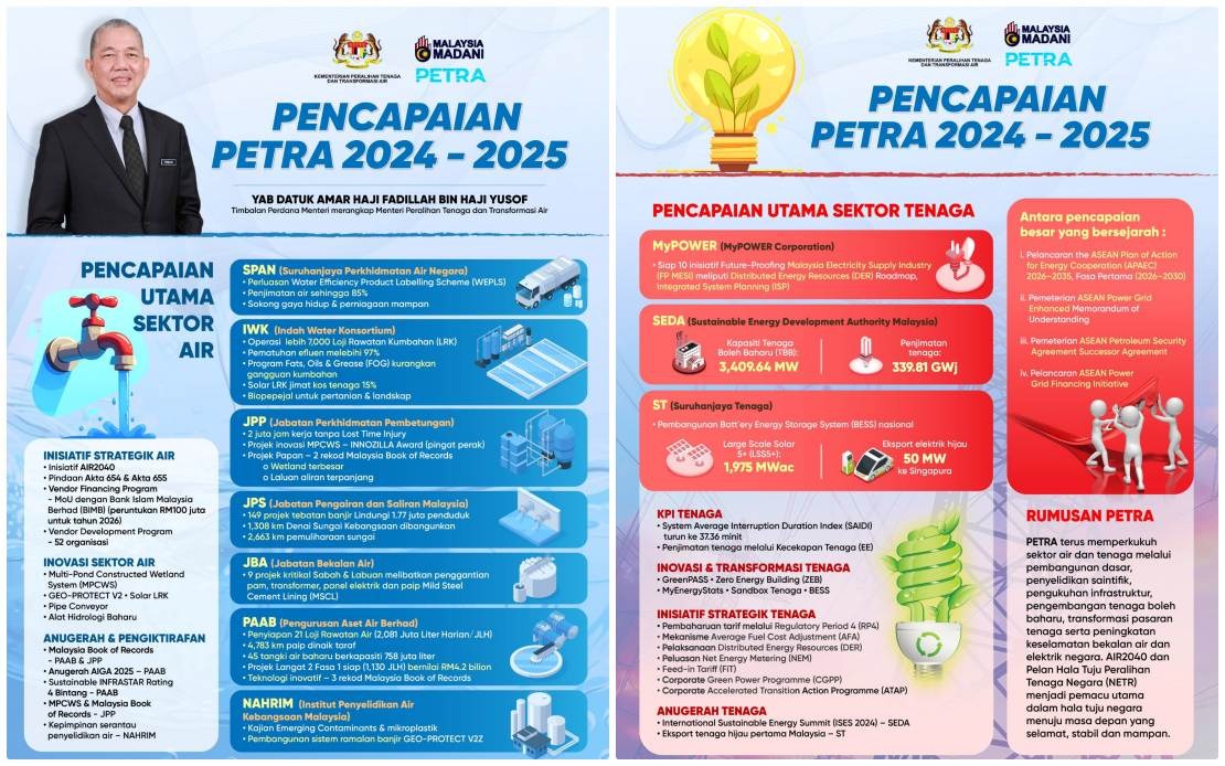 KUALA LUMPUR, 29 Dis — Kerajaan MADANI melalui Kementerian Peralihan Tenaga dan Transformasi Air (PETRA) mencatatkan pencapaian signifikan dalam usaha memperkukuh sektor air dan tenaga negara bagi tempoh 2024 hingga 2025.