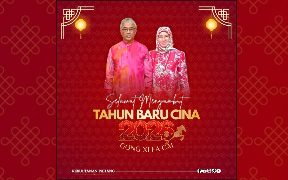 KUANTAN, 16 Feb — Sultan Pahang Al-Sultan Abdullah Ri’ayatuddin Al-Mustafa Billah Shah dan Tengku Ampuan Pahang Tunku Azizah Aminah Maimunah Iskandariah menzahirkan ucapan selamat Tahun Baharu Cina kepada rakyat Pahang dan di seluruh negara yang menyambut perayaan berkenaan.