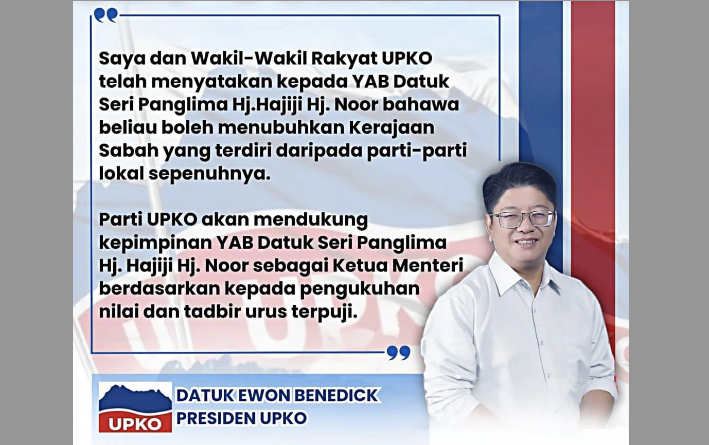 “Saya dan wakil-wakil rakyat UPKO menyatakan kepada Hajiji bahawa beliau boleh menubuhkan Kerajaan Sabah yang terdiri daripada parti-parti lokal sepenuhnya.