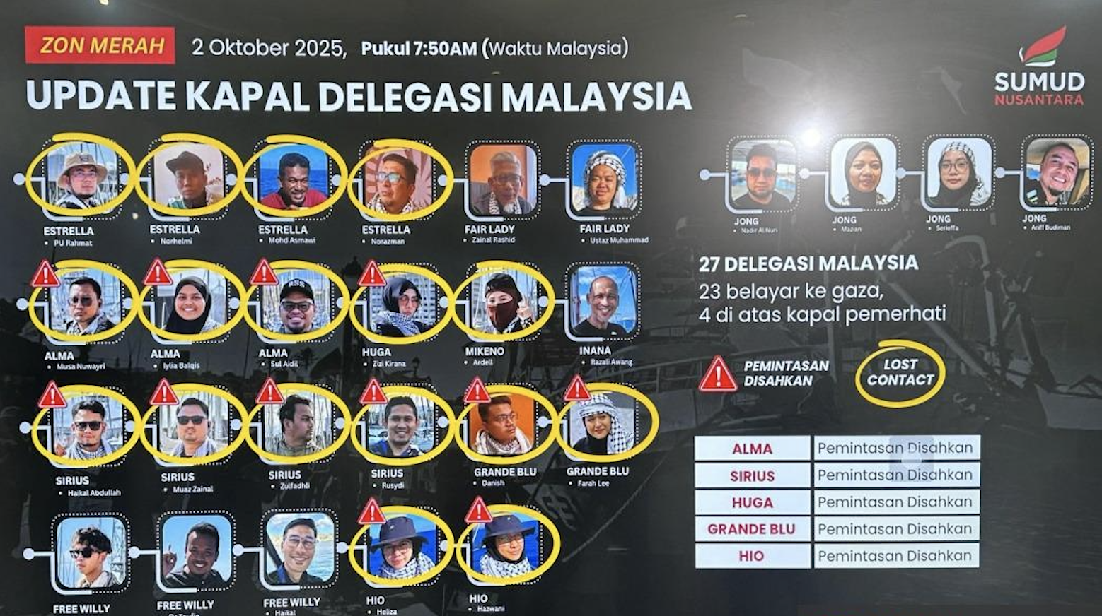 KUALA LUMPUR, 2 Okt — Berikut senarai rakyat Malaysia yang ditahan tentera Israel dalam misi kemanusiaan Global Sumud Flotilla (GSF) ke Gaza setakat 7.50 pagi: