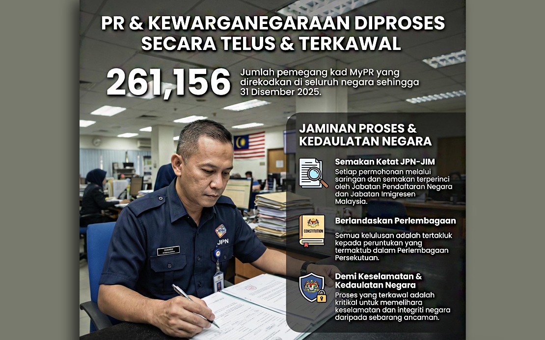 KUALA LUMPUR, 25 Jan — Kementerian Dalam Negeri (KDN) menerusi Jabatan Pendaftaran Negara (JPN) memberikan jaminan bahawa proses pemberian Kad Pengenalan Pemastautin Tetap (MyPR) dan kewarganegaraan Malaysia dilaksanakan secara ketat, telus dan berpandukan undang-undang, susulan kebimbangan yang disuarakan berhubung isu berkenaan.