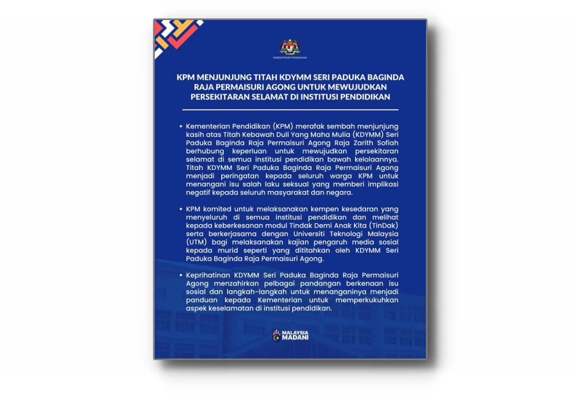 “Keprihatinan Raja Permaisuri Agong yang menzahirkan pandangan berhubung isu sosial dan langkah menanganinya menjadi panduan kepada KPM untuk terus memperkukuh aspek keselamatan di institusi pendidikan,” menurut kenyataan itu.
