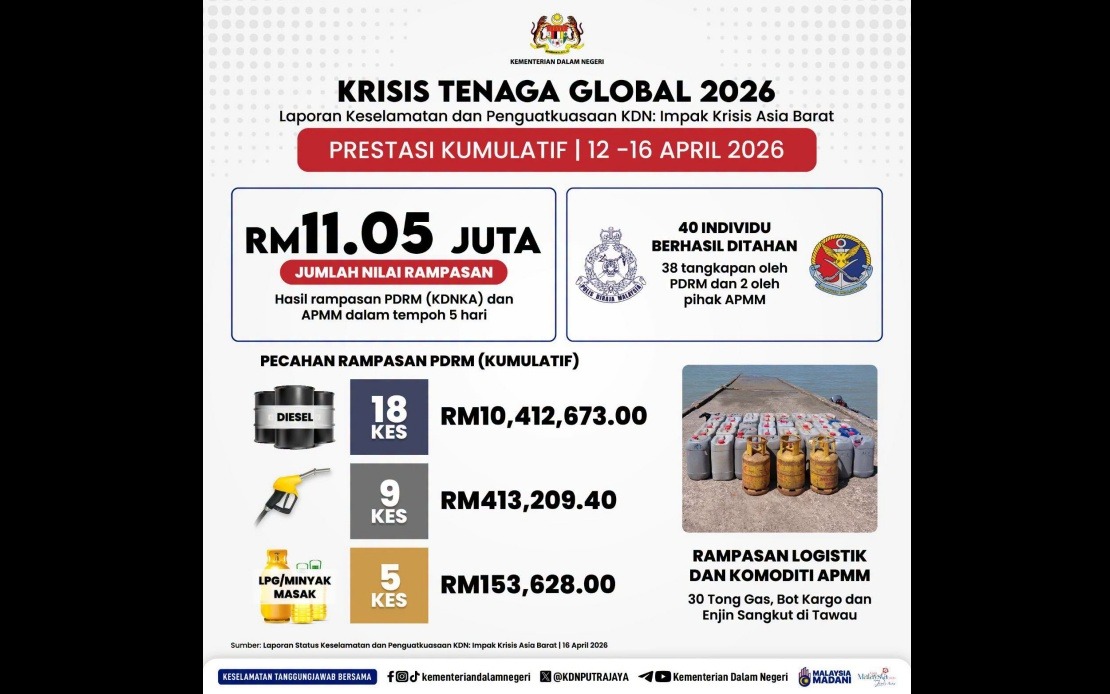 PUTRAJAYA, 20 April — Kementerian Dalam Negeri (KDN) terus mempergiat operasi penguatkuasaan secara bersepadu dalam menangani impak krisis tenaga global yang memberi tekanan kepada rantaian bekalan dan keselamatan ekonomi negara dengan mencatat RM11.05 juta jumlah keseluruhan nilai rampasan bagi tempoh 12 hingga 16 April.