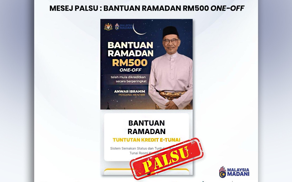 Menerusi hantaran di Facebook yang turut dikongsikan Perdana Menteri Datuk Seri Anwar Ibrahim, MOF memaklumkan poster “Bantuan Ramadan RM500 one-off” berserta gambar Perdana Menteri itu adalah palsu.