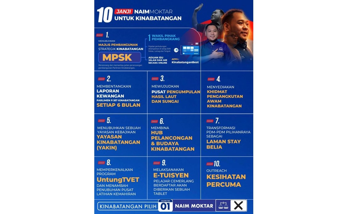 Ketua Pemuda UMNO Kinabatangan itu turut berjanji akan membentangkan laporan kewangan setiap enam bulan, selain mewujudkan pusat pengumpulan hasil laut dan sungai bagi meningkatkan pendapatan nelayan serta menyediakan perkhidmatan pengangkutan awam di Kinabatangan.