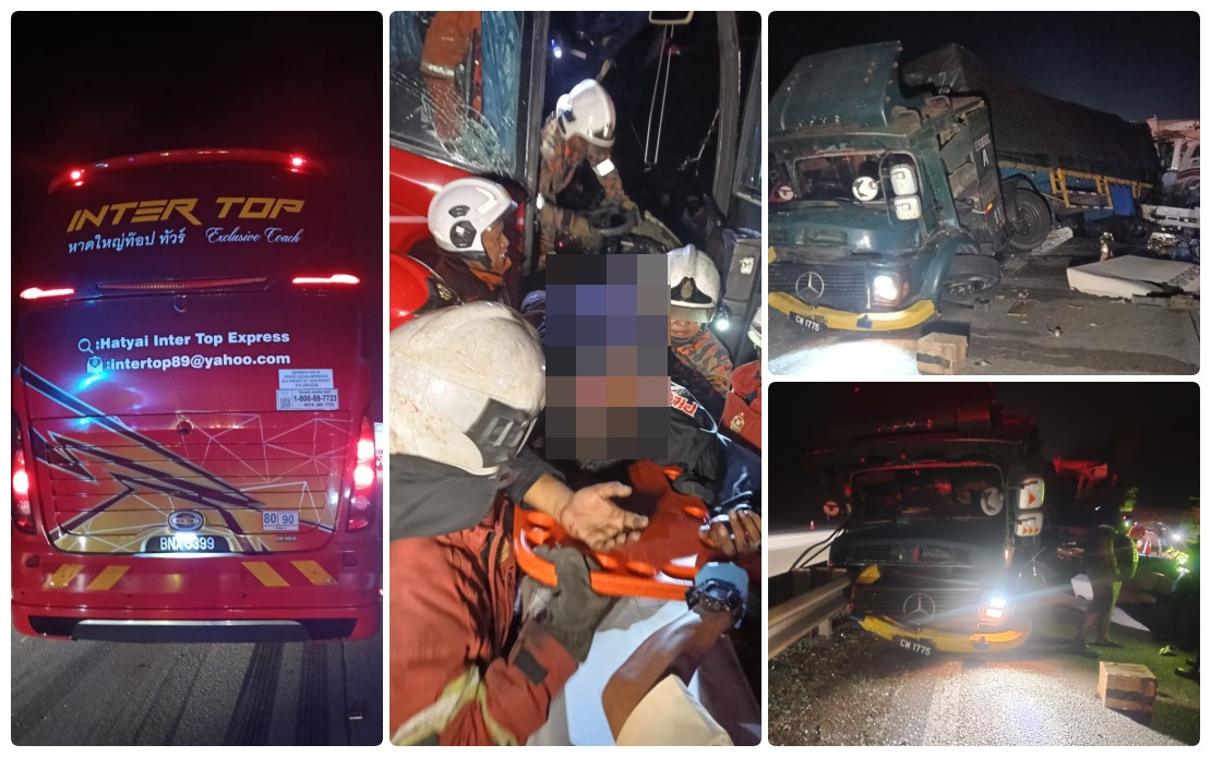 KUALA LUMPUR, 5 Feb — Seorang lelaki maut manakala tujuh individu cedera termasuk seorang kanak-kanak perempuan dalam nahas membabitkan sebuah bas ekspres, lori dan treler di Kilometer 433 Lebuhraya Utara-Selatan (PLUS) arah selatan berhampiran Rawang, awal pagi tadi.