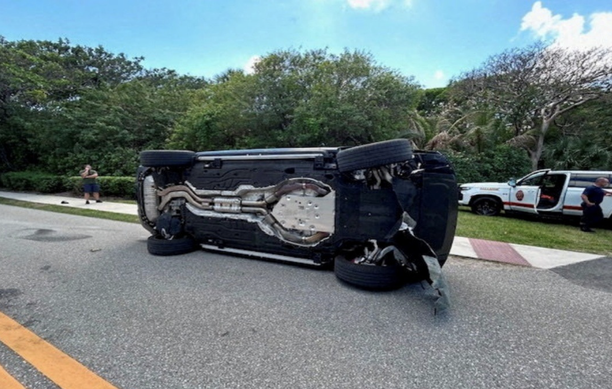 The officer then walked over to speak with the driver of the other vehicle, which was towing a trailer, with Woods’ black Range Rover flipped on its side at the junction of a narrow side road.