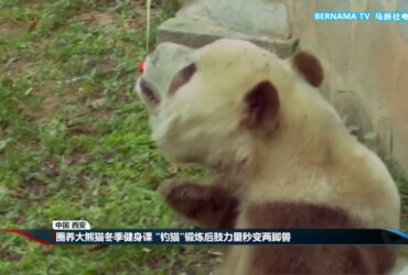 圈养大熊猫冬季健身课 “钓猫”锻炼后肢力量秒变两脚兽