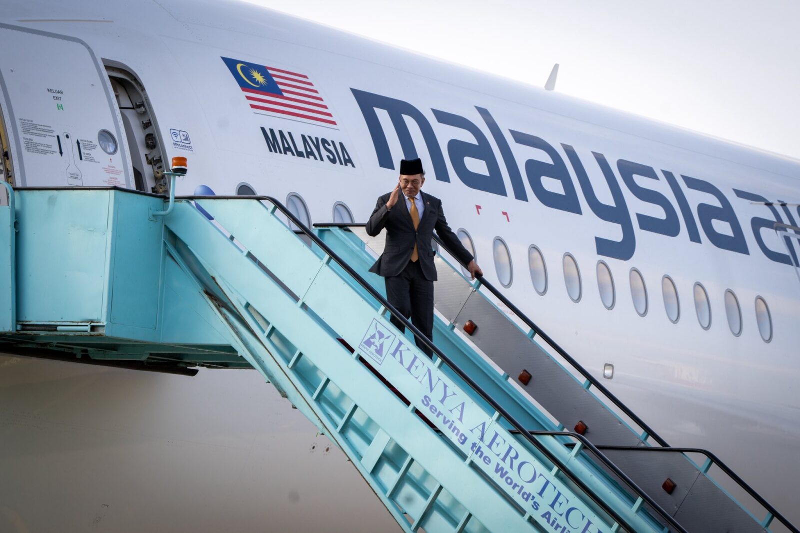 YAB Perdana Menteri, Dato' Seri Anwar Ibrahim tiba di Lapangan Terbang Antarabangsa Jomo Kenyatta untuk memulakan lawatan rasmi ke Republik Kenya. MITI. NO SALES; NO ARCHIVE; RESTRICTED TO EDITORIAL USE ONLY. NOTE TO EDITORS: This handout photos may only be used for editorial reporting purposes for the contemporaneous illustration of events, things or the people in the image or facts mentioned in the caption. Reuse of the pictures may require further permission. MANDATORY CREDIT - MITI