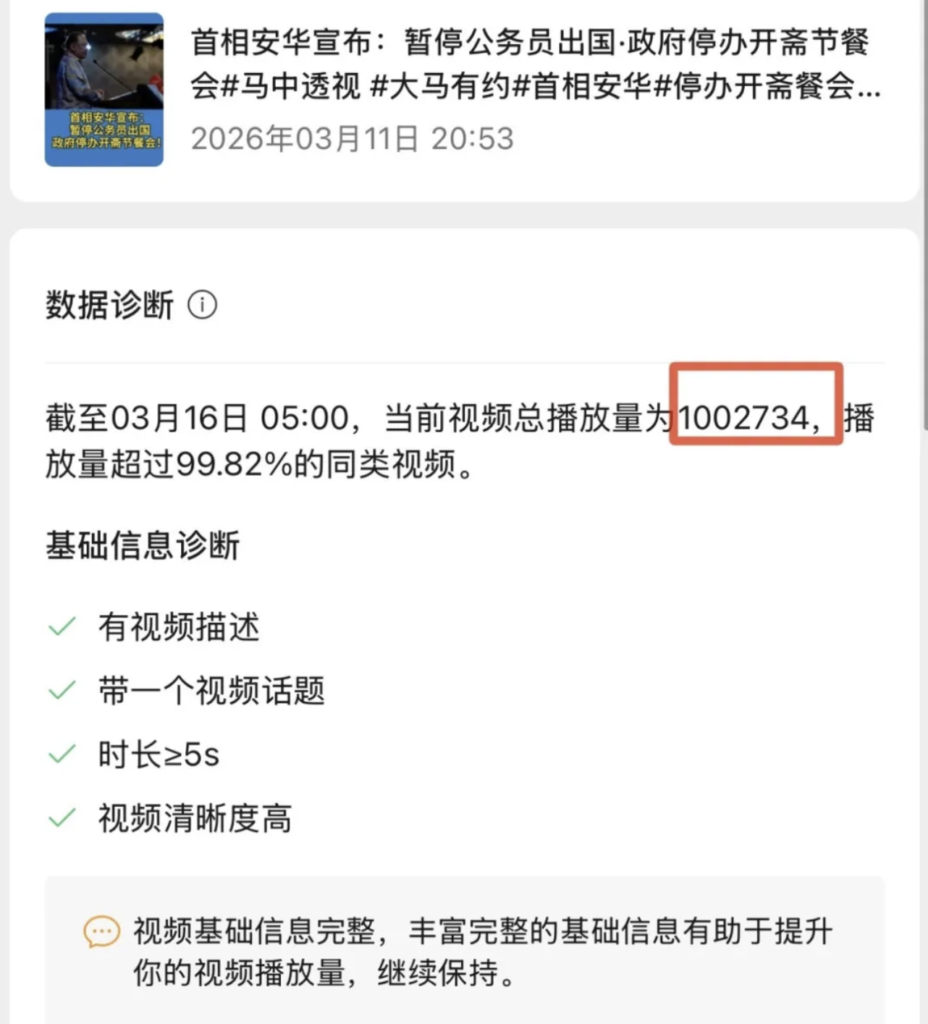 (吉隆坡16日讯)感谢广大读者和粉丝长期以来的关注与支持!昨日(3月15日),《马中透视》视频号单条新闻浏览量突破100万。这不仅是一个令人振奋的数字里程碑,更充分体现了平台对内容深度与传播广度的高度认可。