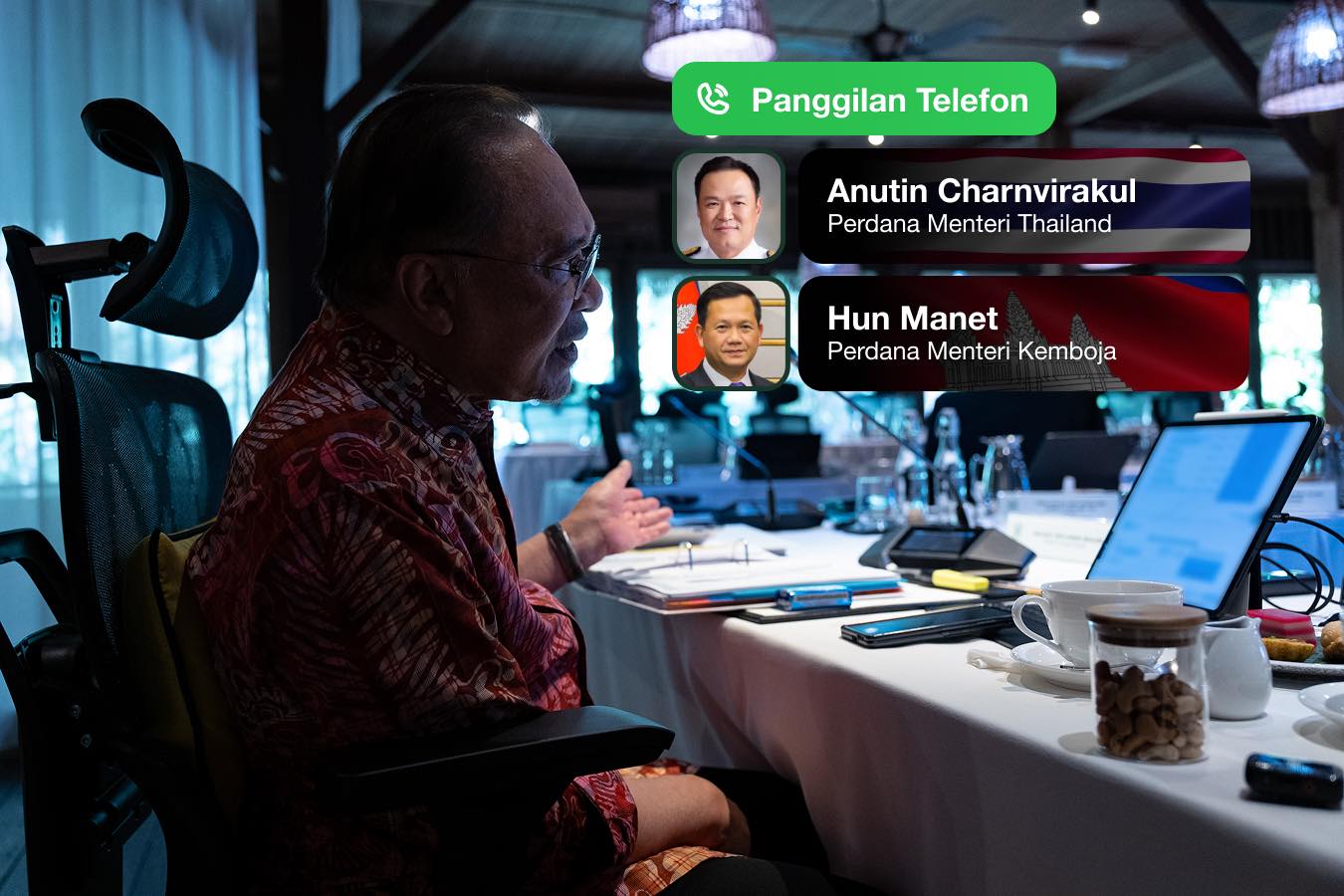 首相拿督斯里安华今日在脸书发帖指出,基于泰柬边境局势持续紧张,他在与美国总统特朗普进行讨论后,分别与泰国首相阿努廷及柬埔寨首相洪马内通电话提出上述事项。