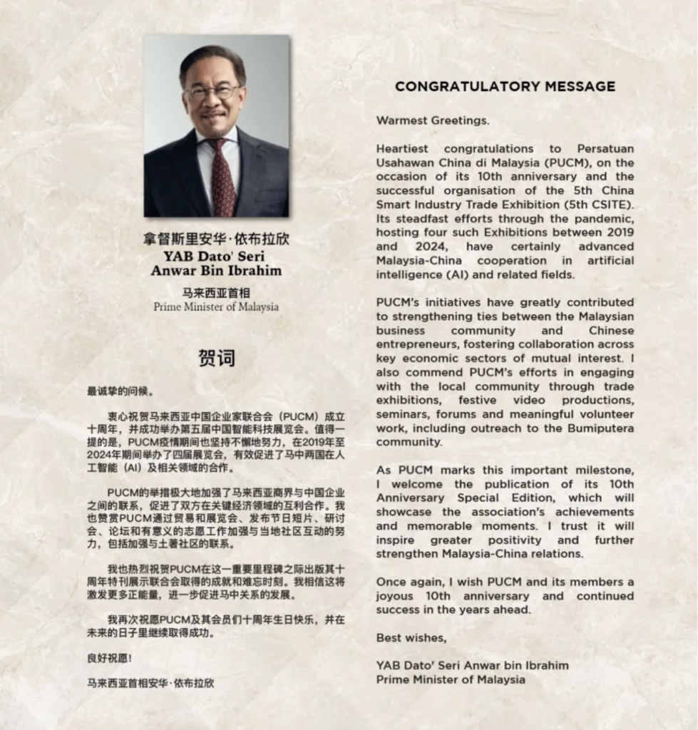 拿督李中平赠送马来西亚中国企业家联合会(PUCM)成立10周年特刊予首相安华,并亲自感谢首相安华给予贺词肯定PUCM过去10年对马中友好作出的贡献。