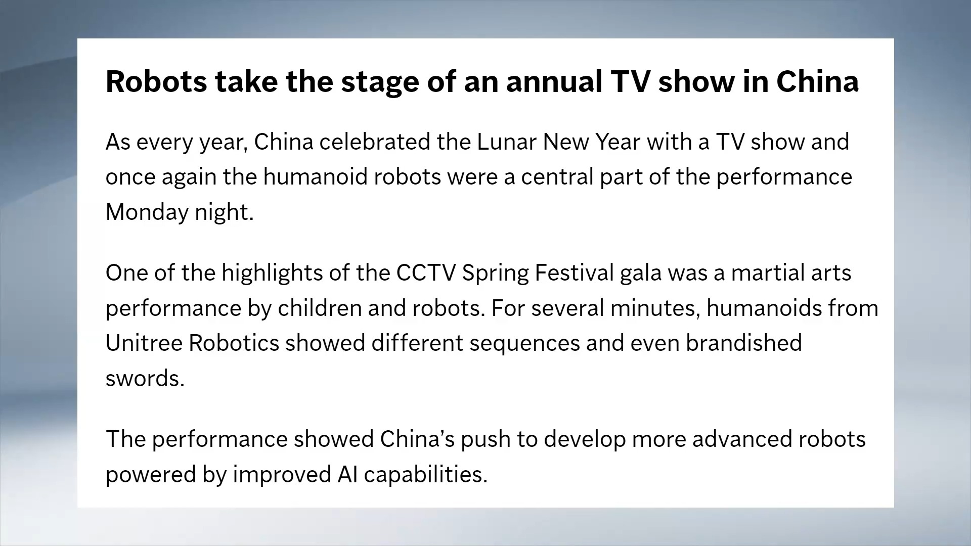 美联社的报道说,中国今年春晚的一大亮点就是少年与人形机器人联袂的武术表演。