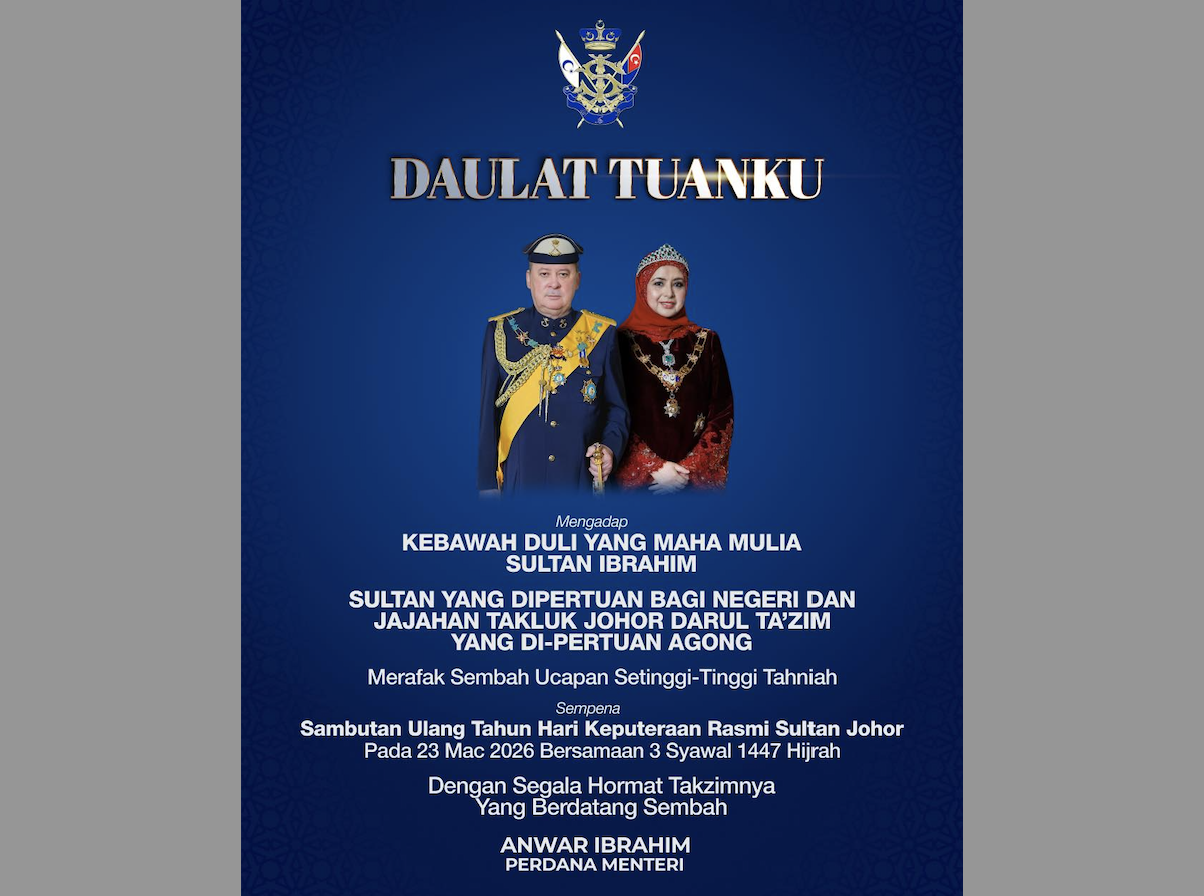 “值此柔佛州及其属地苏丹兼国家元首依布拉欣陛下2026年3月23日官方华诞之际,谨此致以最崇高的祝贺与美好的祝福。