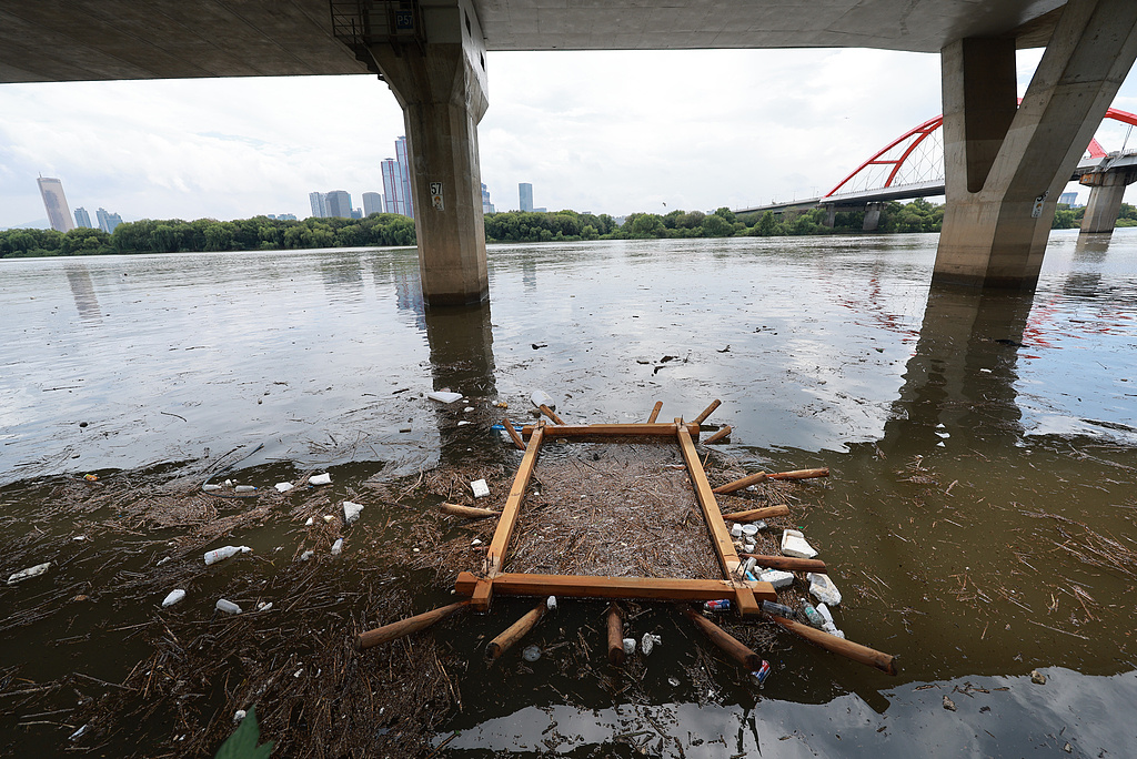 韩国首尔,汉江边因强降雨冲刷而堆积的垃圾。
