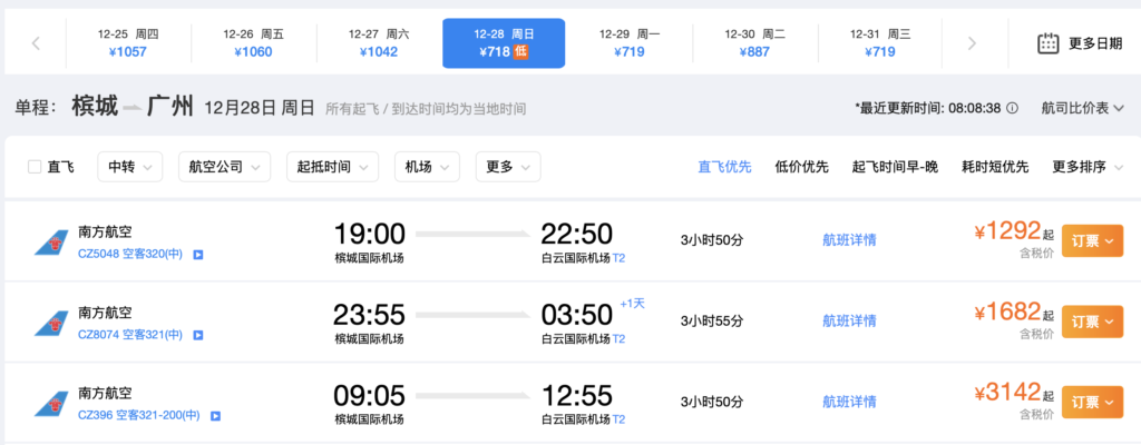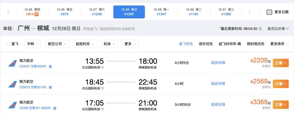 中国南方航空计划自12月28日起,加密广州直飞槟城航线至每天3班,使用空客320及321-200客机执飞,详细航班信息如下图: