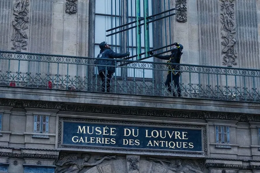 (巴黎24日讯)法国卢浮宫博物馆23日在阿波罗长廊展厅窗户上安装铁栏。不久前,窃贼在光天化日之下闯入这座巴黎地标,从阿波罗长廊盗走多件王室珠宝。